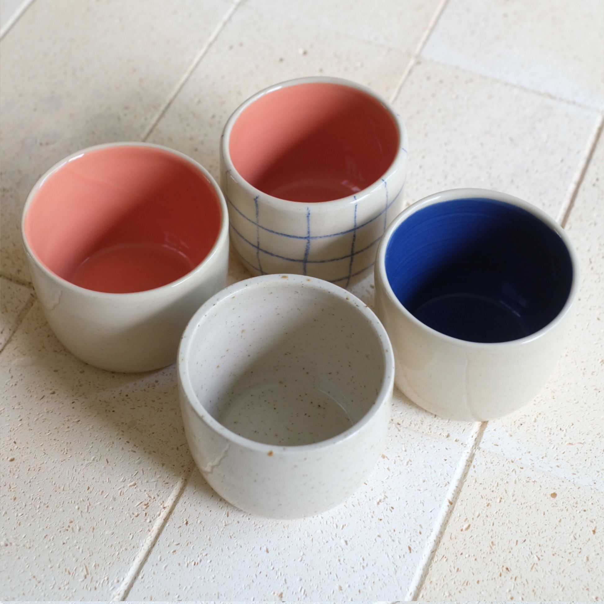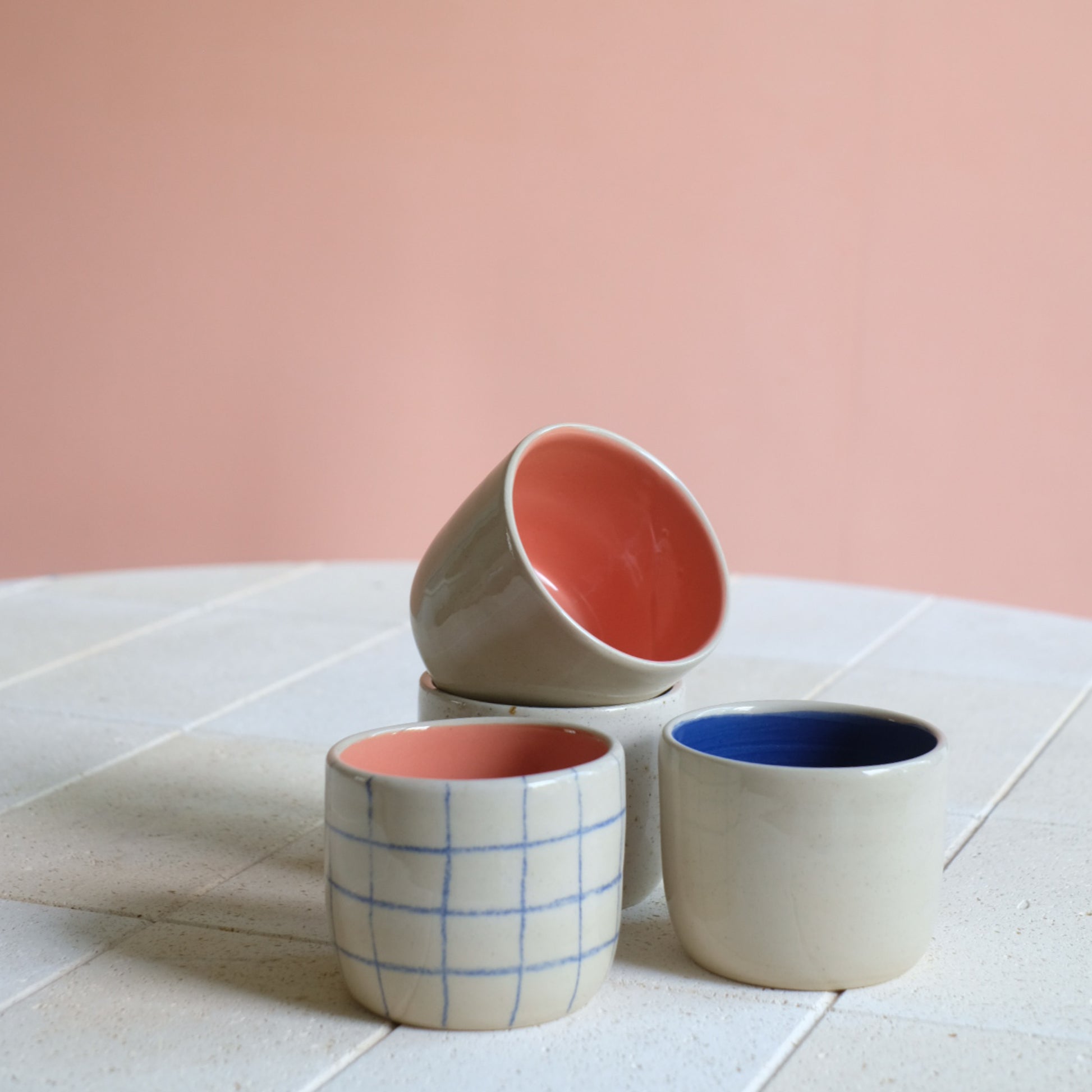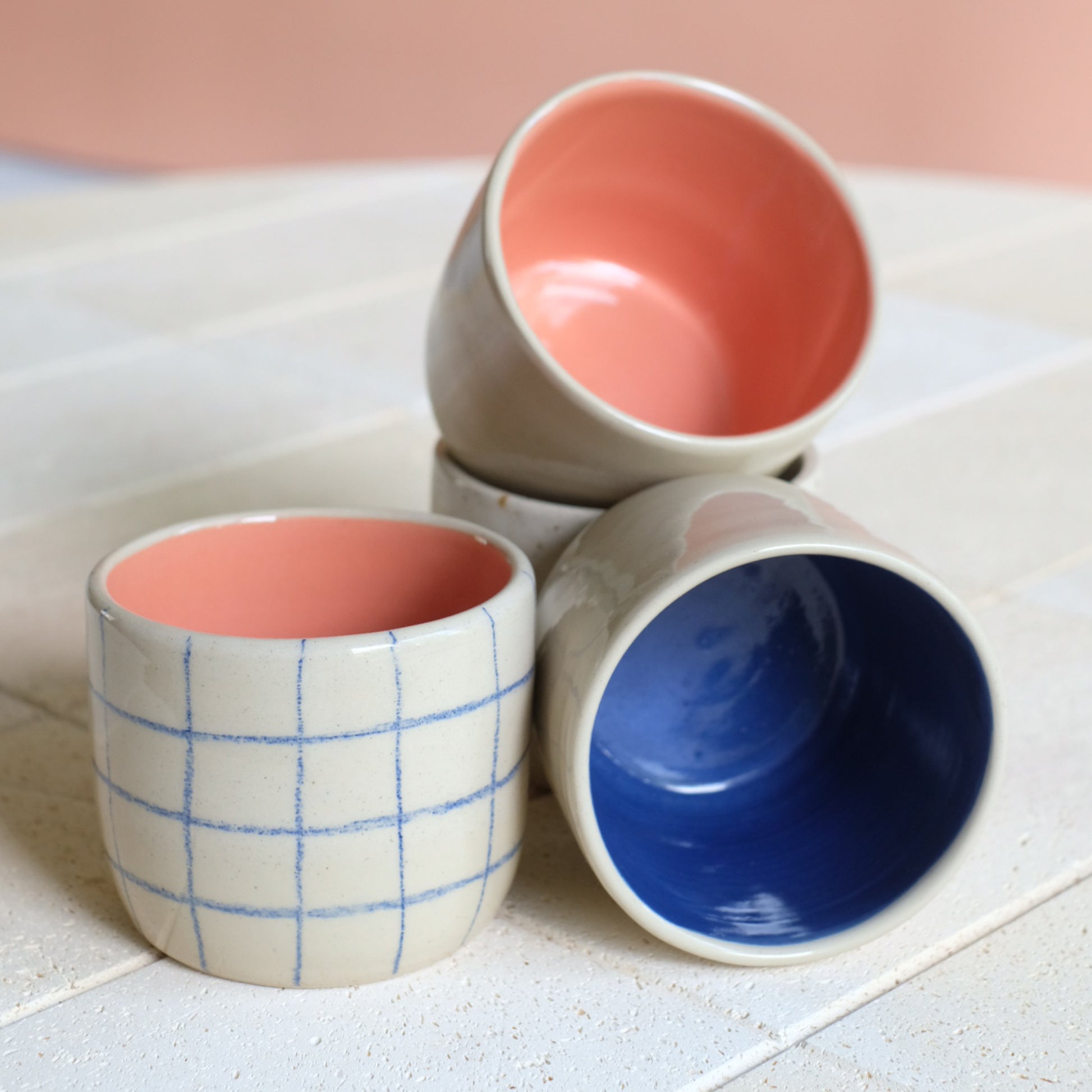 Diese wunderschönen Cappuccino-Becher aus der mescalins-Serie bieten dir drei verschiedene Designs zur Auswahl: naturfarbene Becher mit Apricot-Innenseite, naturfarbene Becher mit blauer Innenseite und das beliebte blaue Karo-Design mit Apricot-Innenseite.