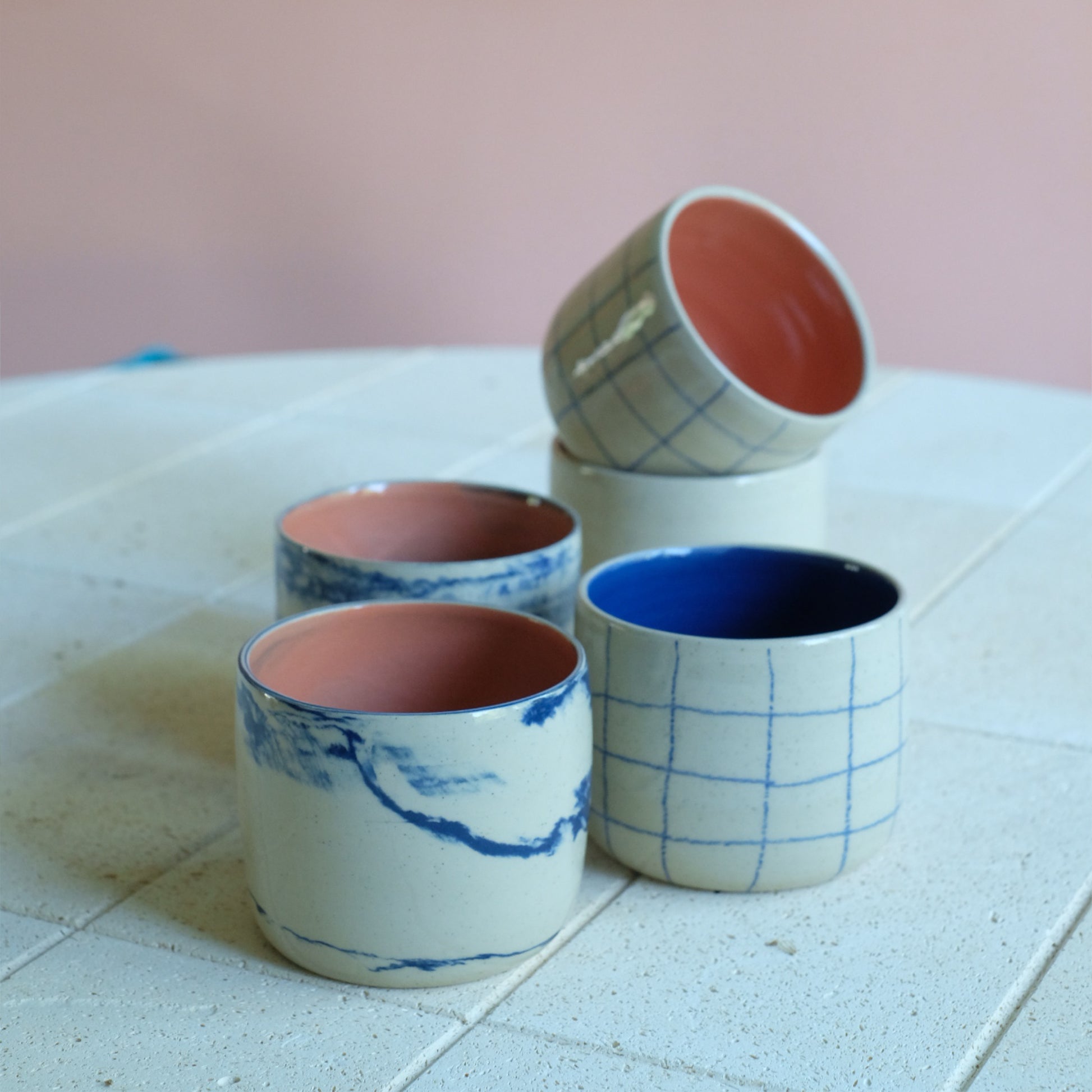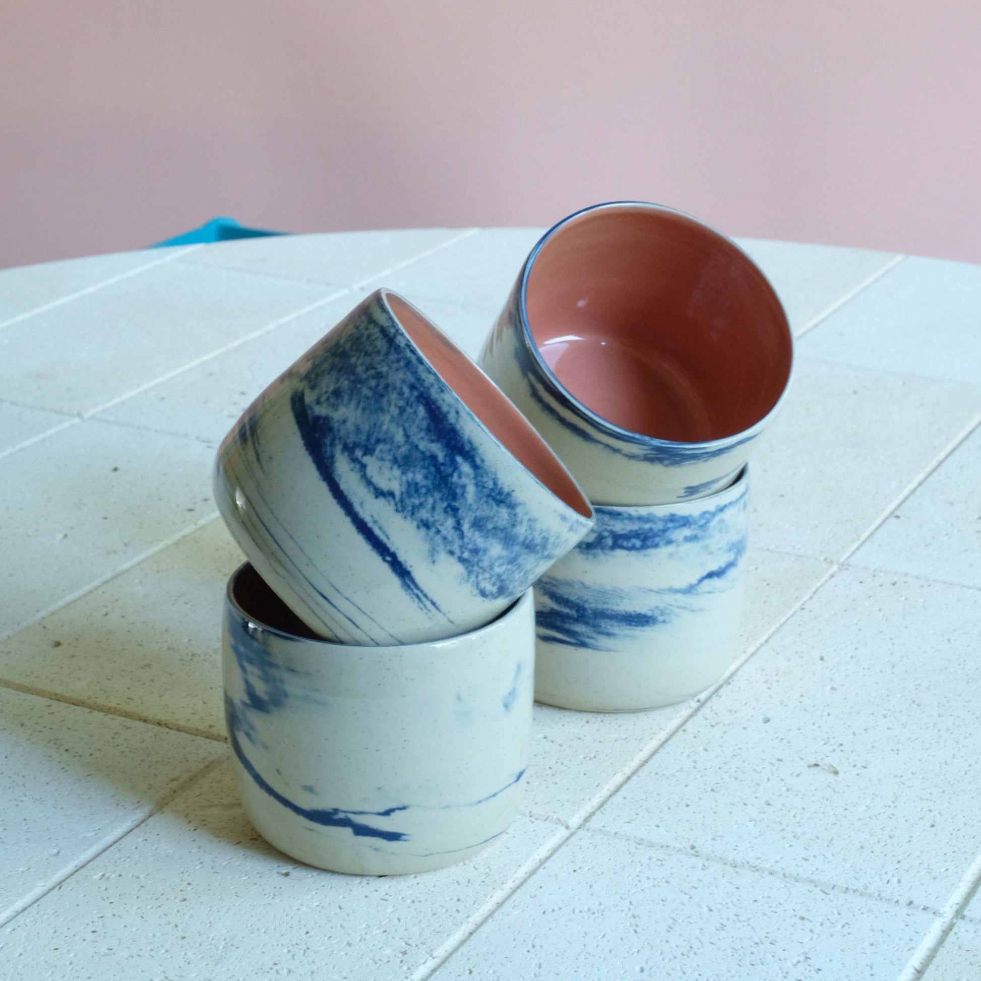 Diese wunderschönen Becher aus der mescalins-Serie bestechen durch ihre organische Marmorierung in kräftigen Blautönen auf cremefarbener Basis. Die warme Apricot-Innenseite sorgt für einen besonderen Kontrast und macht jeden Moment zu einem ästhetischen Erlebnis.